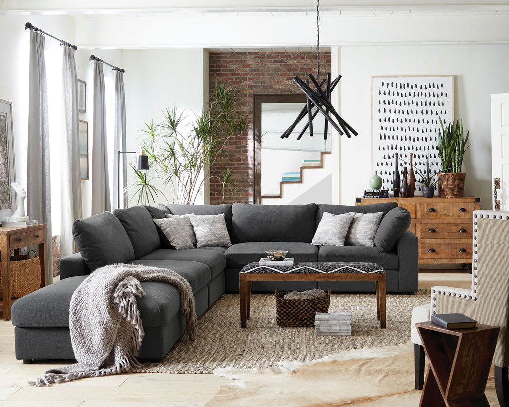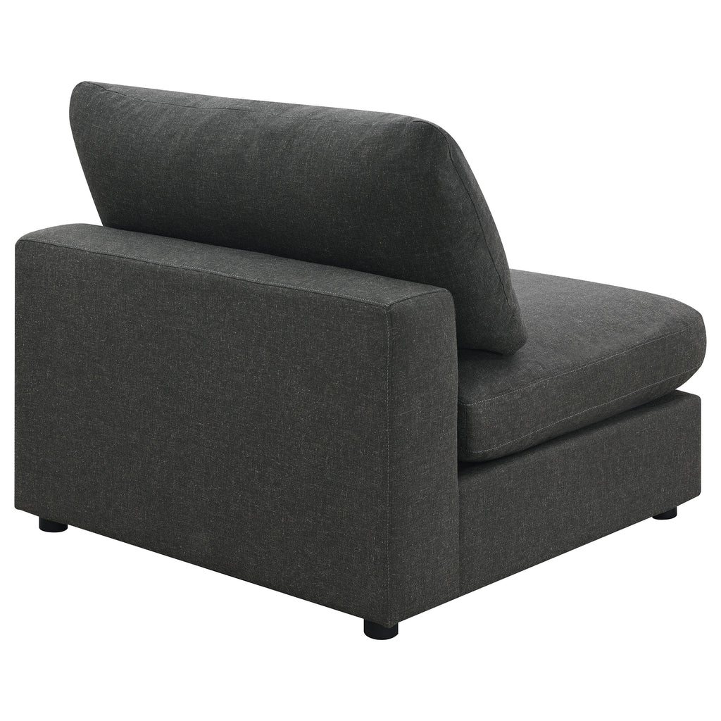 Create your own modular home setup with this plush, armless chair. It entices you to sink into its deep, comfortable cushions. The chair can function alone, as well as part of a larger sectional sofa. The simple lines of the piece add up to a comfy, easy-to-use element in any decor. Linen adds a natural textural accent.