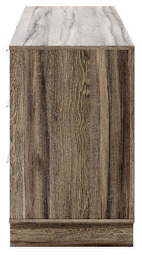 Your modern sanctuary is within reach. The subtle design of this dresser is accented with a low profile base. Its weathered brown finish is complemented with refined champagne-colored handles on the six smooth-gliding drawers.