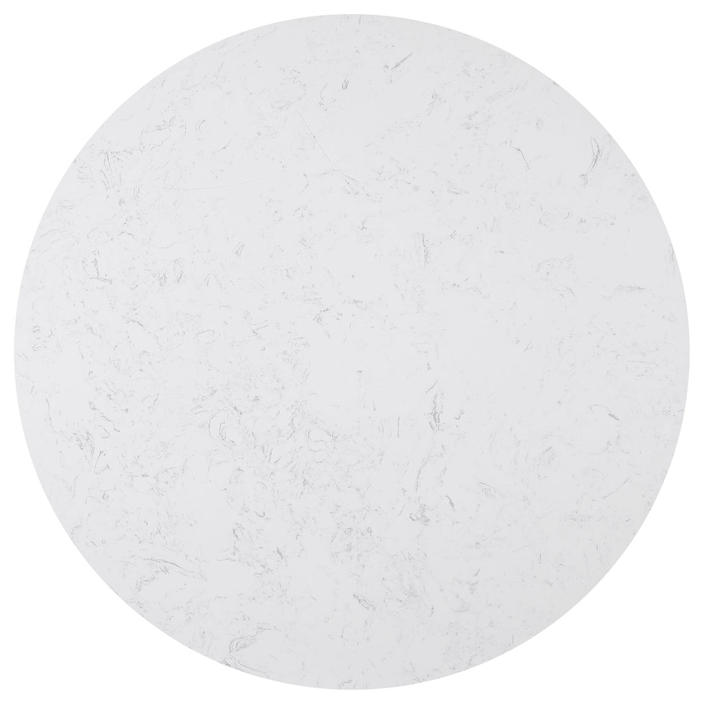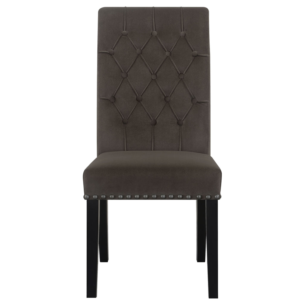 This elegant, contemporary, five-piece dining set completes formal dining experiences with a round, white, cultured marble, and rustic espresso pedestal table and four upholstered parson style side chairs. Charming details like button-tufted rolled backrests, bold nailhead trim, and flared legs lend a classical approach with modern elements.