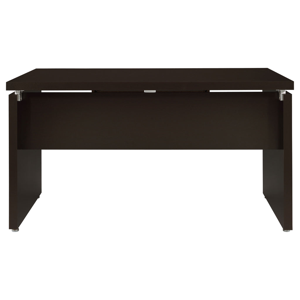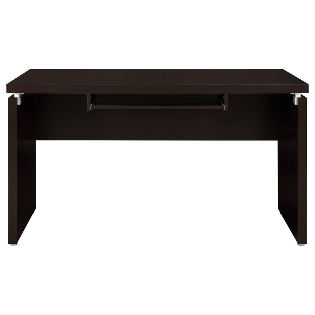This modern computer desk blends sleek design with practical features for a sophisticated workspace. Constructed from durable engineered wood with a wood-look laminate veneer, it offers both style and functionality. The floating top design adds a contemporary flair, while the keyboard tray provides easy access to essential devices and accessories. Finished in a rich, versatile tone, this desk is perfect for home offices, providing a clean and minimalistic aesthetic with ample work space for your computer, documents, and more. Key Features: • Sleek computer desk with a contemporary floating top design for modern style • Built from engineered wood with a wood-look laminate veneer in a cappuccino finish • Features a convenient pull-out keyboard tray for easy access to your devices • Offers ample workspace for computers, documents, and office supplies • Simple, clean lines make it ideal for both home and office environments • Sturdy construction ensures lasting durability and stability for daily use