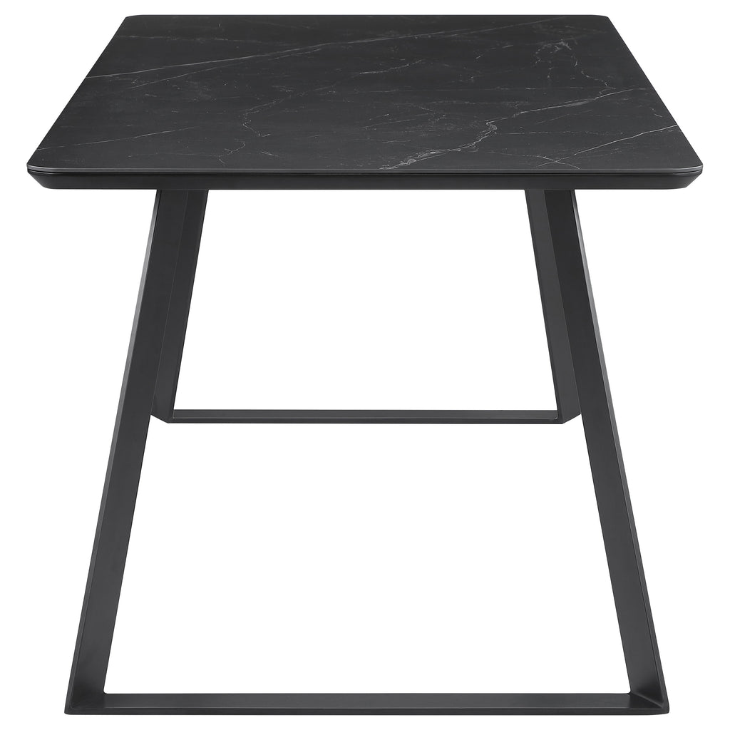 Elevate your dining experience with the stunning five-piece dining table set that seamlessly blends modern elegance with mid-century charm. The 71-inch dining table features a sleek black ceramic top with delicate white striations, creating a marble-like masterpiece perfect for any stylish home. Complementing this table are four upholstered side chairs, each wrapped in sophisticated grey fabric and supported by tapered gunmetal legs for a contemporary touch. This set promises to be the centerpiece of your dining room, offering both ample seating and unparalleled style. Transform everyday meals into extraordinary moments with this exquisite dining ensemble.