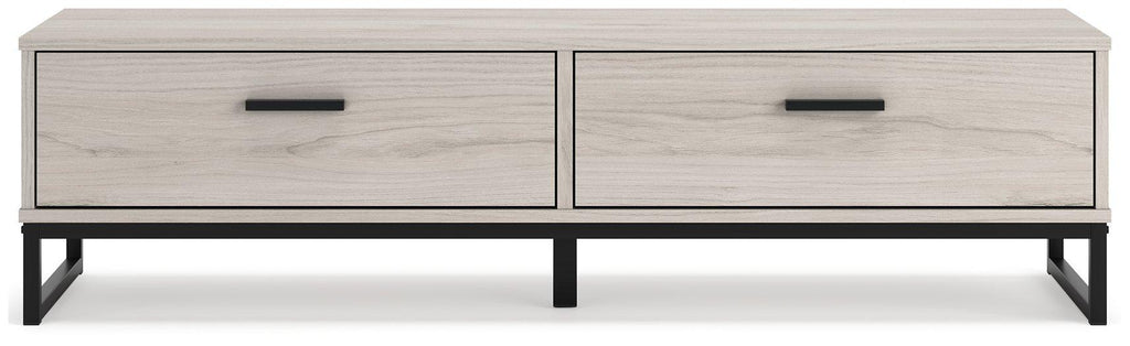 Spruce up your entryway or mudroom with this streamlined storage bench. Two spacious drawers are your new go-to spot for hats, scarves and outdoor gear. Contemporary handles and sled-style legs with a dark pewter-tone finish emphasize the sleek, contemporary profile.