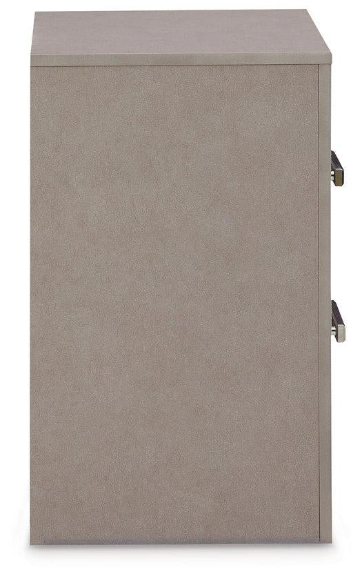 Love sleek and bold contemporary style? Drink in the beauty of this nightstand. Its eye-catching details include glam glitter accents and the look of leather grain with a subtle gray finish. Large-scale linear handles, in a sophisticated champagne chrome tone, play perfectly with the streamlined aesthetic. This bedside piece is a simply stunning way to achieve the bedroom of your dreams.