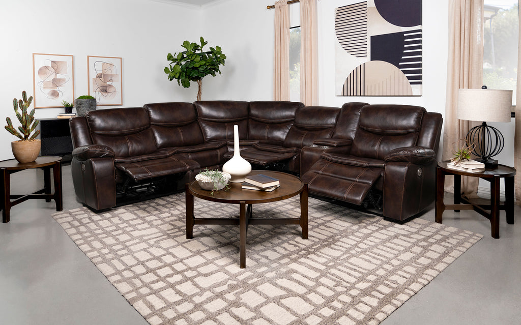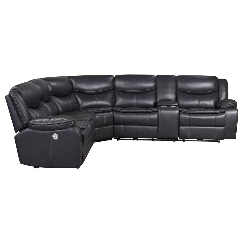 An all-in-one venue for entertainment delivers convenience and beauty in the three-piece power sectional set. Modern design features and a sleek rounded silhouetting suits style needs and assures inviting comfort for extended periods of watching movies and sports. Gorgeous leatherette upholstery enriches any living room or media room, embellished with pillowy foam filling and batting arranged carefully through tufting and channeling. Sinuous spring seating and attached seat and back cushions form individual luxury as seats feature power reclining for smooth, easy positioning. Keep beverages handy in two cup holders and stash remotes and accessories in a flip-top console.