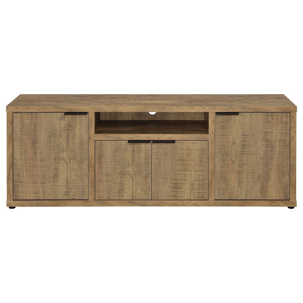 Transform your entertainment space into a rustic haven with our TV stand, drenched in a warm mango finish. Thoughtfully designed, it boasts six storage compartments ensuring all your media essentials have a designated spot. Two adjustable shelves offer flexibility, while the four doors keep your equipment and accessories concealed yet accessible. To further enhance your storage capacity and create a cohesive look, pair the stand with our matching media towers. This ensemble is more than just functional; it's an embodiment of rustic charm, ensuring your media zone is both organized and aesthetically pleasing. Key Features: • Transform your entertainment space with rustic charm and warm mango finish • Six storage compartments and two adjustable shelves for flexible storage • Four doors keep equipment and accessories concealed yet accessible • Pair with matching media towers for cohesive look and enhanced storage capacity • Create an organized and aesthetically pleasing media zone