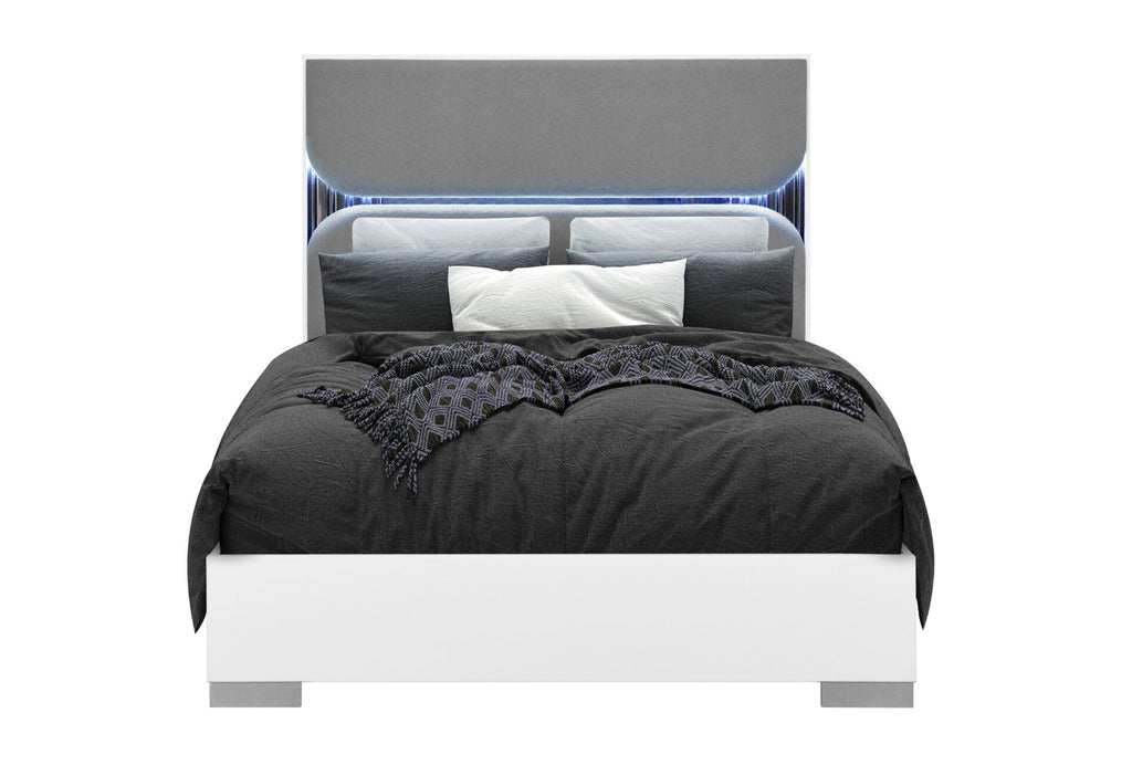 The Talia White Bedroom Collection by Global Furniture USA. This collection is finished in a sleek white finish, exuding elegance and contemporary style. Each piece features textured drawer fronts and modern chrome accents, adding a touch of sophistication. The standout upholstered headboard of the bed includes LED accent lighting, creating a serene ambiance. This collection seamlessly combines functionality with modern design, making it a perfect choice for any stylish bedroom.