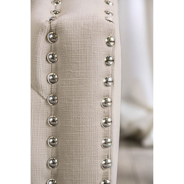 Tegan Beige/Light Blue Love Seat, 63"W X 36"D X 35 1/2"H, 105lbs. Like a beautiful shoreline, this scenic sofa set is soothing and brings just the right amount of calming atmosphere to your home. The beige and blue color palette is just beautiful and flexible enough to allow you to decorate your home however you li ke. Envision this set in your living room, or a even in your foyer, this high track arms and delicate feet give it a compact look that is sophisticated and altogether comfortable. Bring a part of the beach into your home. Features: Transitional Beige Plush Microfiber, Solid Wood Frame High Track Arms Microfiber Upholstering Button Tufted Nailhead Trim Tappered Wooden Feet Pillows Included