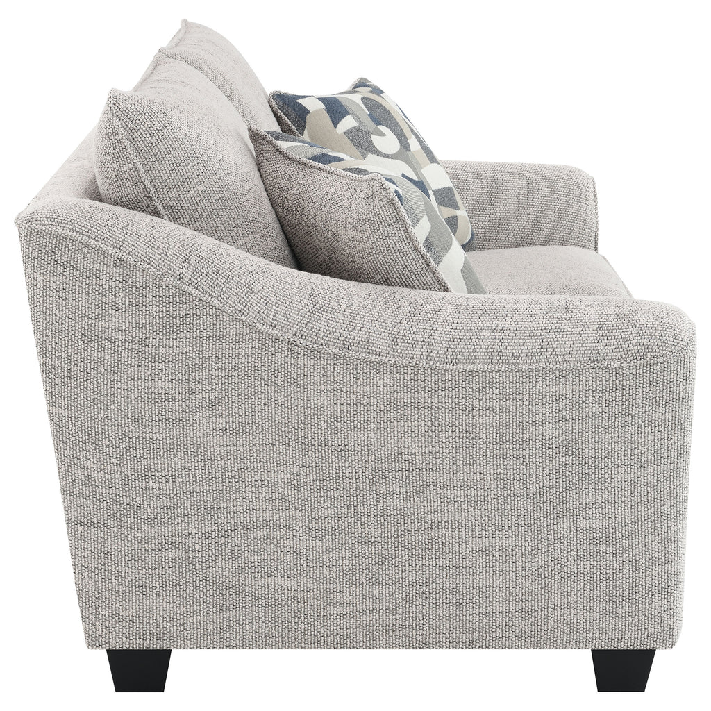 Instill a sense of comfort and inviting elegance in your living space with this well-tailored modern loveseat from our sofa collection. Showcasing a wonderfully textured boucle fabric in a multidimensional gray hue, it's not only contemporary and flexible but also perfect for camouflaging wear. The loveseat features sloped arms, boxed seat cushions, and tall back pillows, all finished with a welt trim, blending beautifully with existing furniture and decor. Its impressive comfort is augmented by foam cushions and the inviting look of gently sloping armrests. Resting on tall block legs for a sturdy foundation, this loveseat is a perfect addition to any casual living space, and can be further enhanced with accent pillows or a throw for a dose of color.