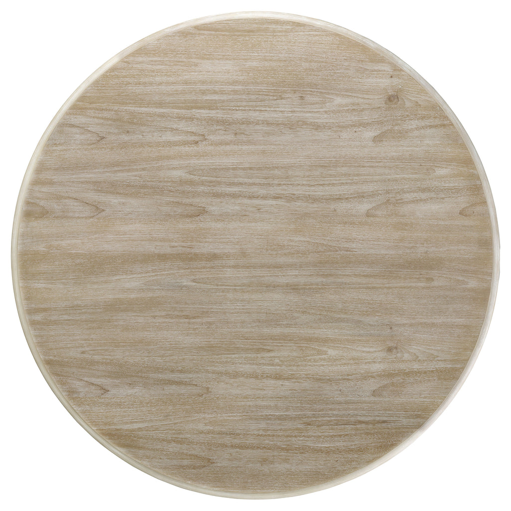 Create a welcoming, warm ambiance for meals with the family with this five-piece modern dining set. A chic blend of contemporary and casual styles, it features wood construction with a wire brushed, whitewashed finish that's light and fresh in a kitchen or dining room. The set features a round table with a distinctive pedestal base that features four curved legs on a round, stepped disc base. Four stylish side chairs accompany the table, featuring plush foam padding and light beige upholstery that complements the wood finish perfectly. Chairs have full, padded backs, perfect for leisurely dining with friends and family. Key Features: • A five-piece modern dining set sets a sculptural tone with a bold, curved pedestal table • Round table features four curvy legs that creates a chic, flowing pedestal base design • Chairs feature foam padding with beige upholstery that offers a neutral touch in any space • Wire brushed adds a distressed touch to a rich whitewash finish over wooden construction • Round, stepped disc base echoes the beveled edge of the tabletop for a cohesive feel