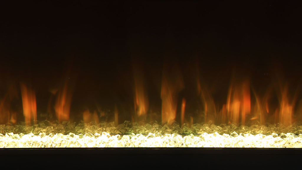Emphasize ambiance with this modern TV stand, constructed from MDF and white glass, featuring a visual flame box insert. Its clean-lined silhouette is fresh and contemporary, making it a perfect focal point for TV entertainment or an ambient room setting. The visual flame box, made from a fire box and acrylic crystals, offers a realistic 3D flame simulator with multi-color settings, all controlled by a remote. Please note, this feature is purely for visual effect and does not generate heat. Easy to maintain due to its white glass material, this inviting TV stand accommodates televisions up to 72 inches and also includes a Bluetooth speaker control.
