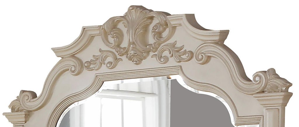 Cosmos Furniture's Victoria traditional style Mirror in antique off-white wood is an impeccable example of truly memorable luxurious traditional design. Your bedroom will be dignified fashion with the center piece. This arched Mirror has a beautiful designed frame with intricate carving around the boarder. Matching Dresser and other bedroom pieces are sold separately.