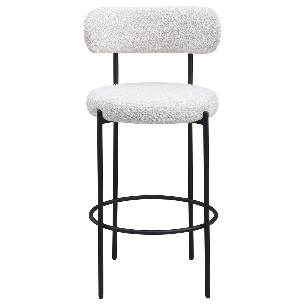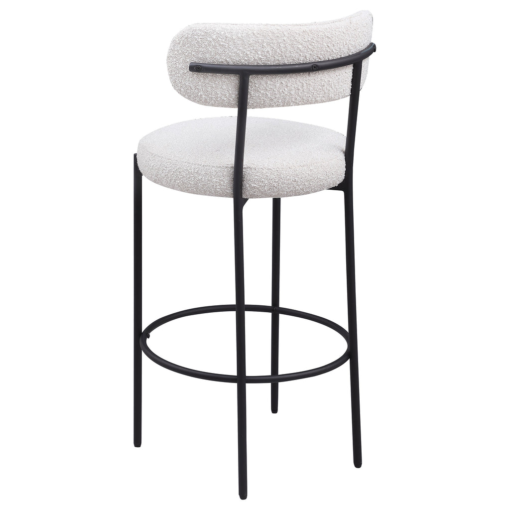 Refresh your kitchen island or elevated bar table with a set of two modern barstools. Each features foam cushions and contemporary boucle upholstery in a neutral hue. Black finish metal framing provides excellent support and durability, while slim legs and supports ensure a chic silhouette. The stools include foam cushions on round seats and curved backrests, offering wonderful comfort for meals and conversation. A ring footrest adds a charming finishing touch and plenty of support. Key Features: • A modern silhouette and foam cushions blend of form and function for this set of two barstools • Boucle upholstery is lightly textured for a fresh look and on-trend appeal • Curved back with rounded sides complements a round seat and offering excellent comfort • Black metal finish frame features a built-in ring footrest and slim, straight legs • Legs feature levelers to ensure that the chair doesn't rock or move unexpectedly