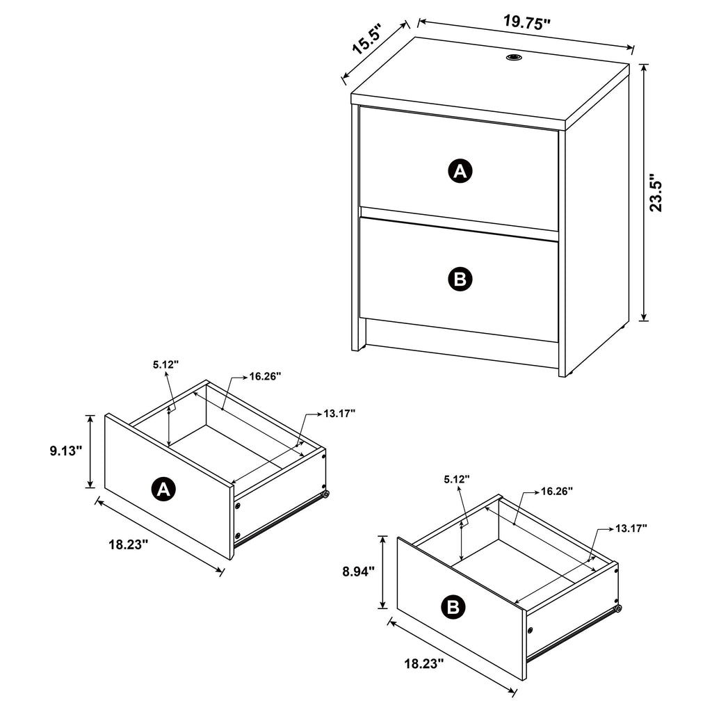 Modernize your bedside with this functional nightstand, featuring a wood-inspired finish. It includes two spacious drawers for ample storage and an integrated dual USB charging outlet with USB-A and USB-C ports for fast and convenient device charging. A motion sensor LED light at the base adds a soft, ambient glow, ideal for nighttime visibility. Built from durable engineered wood with a scratch-resistant laminate veneer, this nightstand combines practicality with sleek design.