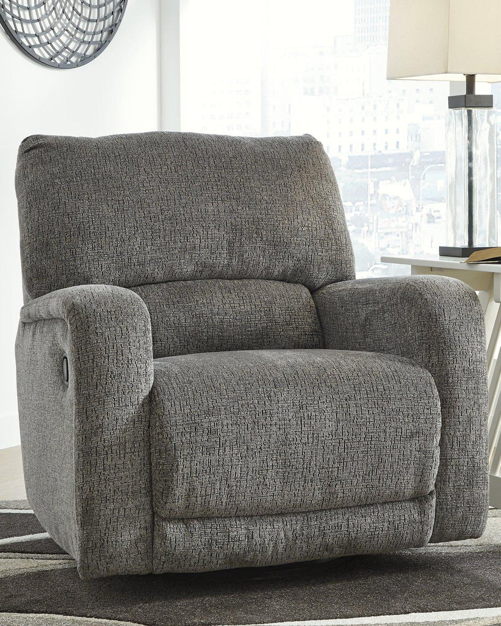 You and plush cushions are two peas in a pod. That’s why this swivel glider recliner will quickly find its way to your heart. Chenille fabric feels so good, you’ll never want to take your hands off of it. Track arms elevate the look with a touch of contemporary sensibility. Ease back into relaxation on the deep seating with one easy pull. Complete with 360-degree swivel, this recliner sets the bar for comfort.