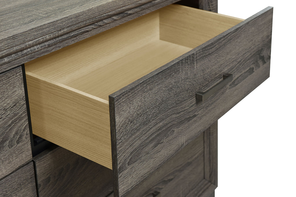 Complete your bedroom storage ensemble with the roomy space in this transitional six-drawer dresser with a framed mirror that attaches directly to the back of the dresser. It boasts a brown oak wood grain finish over laminate surfaces, creating a stylish look that resists everyday wear and tear. The dresser delivers roomy storage in drawer with smooth metal glides and bar pulls, adding the perfect hint of contrast and depth. Mitered trim adorns the front of the case and complements the frame on the mirror to create a sense of angular precision. Use the wide top for a jewelry box and a vase of flowers, or select decor that brings personalized aesthetics to your inviting bedroom. Key Features: • Crisp style enhances the clean lines of a transitional six-drawer dresser with a framed mirror • A brown oak wood grain finish is complemented with metal bar handles that add a touch of contrast • Six drawers create ample storage for clothing, accessories, and personal items in your bedroom • Made from engineered wood with laminate surfaces that resist scratches and dents • Drawers feature center metal extension glides for seamless performance and operation