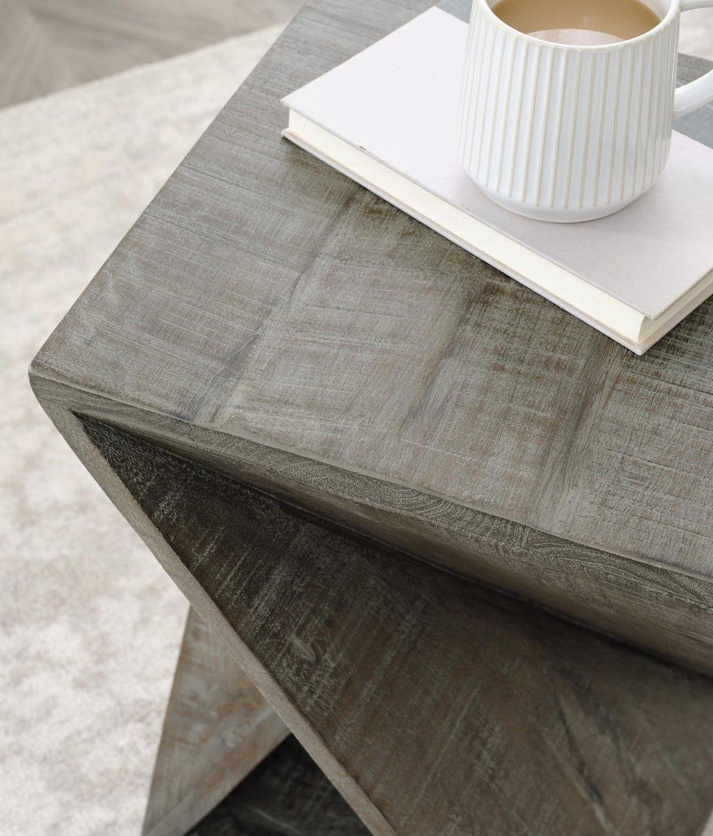 This accent table puts a new twist on vintage casual. Its gray finish is delightfully distressed, drawing attention to the saw mark planks arranged in an open architectural design. Place this unique piece next to a cozy chair to create a charming reading nook overflowing with visual intrigue.
