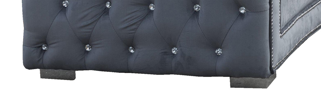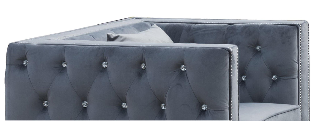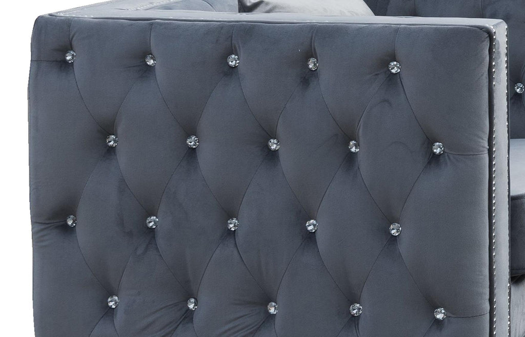 Cosmos Furniture's Zion modern style gray Chair has steel legs with chrome finish. The Zion Chair is elegant and eye catching and is the perfect addition to any space. Modern tufted design shown by the velvet gray color cover, crystal buttons and nail heads. The strength and beauty are guaranteed with sturdy wood frame and chrome legs. This chair is bound to be the conversation piece. One (1) throw pillow is included. Matching more Zion pieces are sold separately to complete the set.